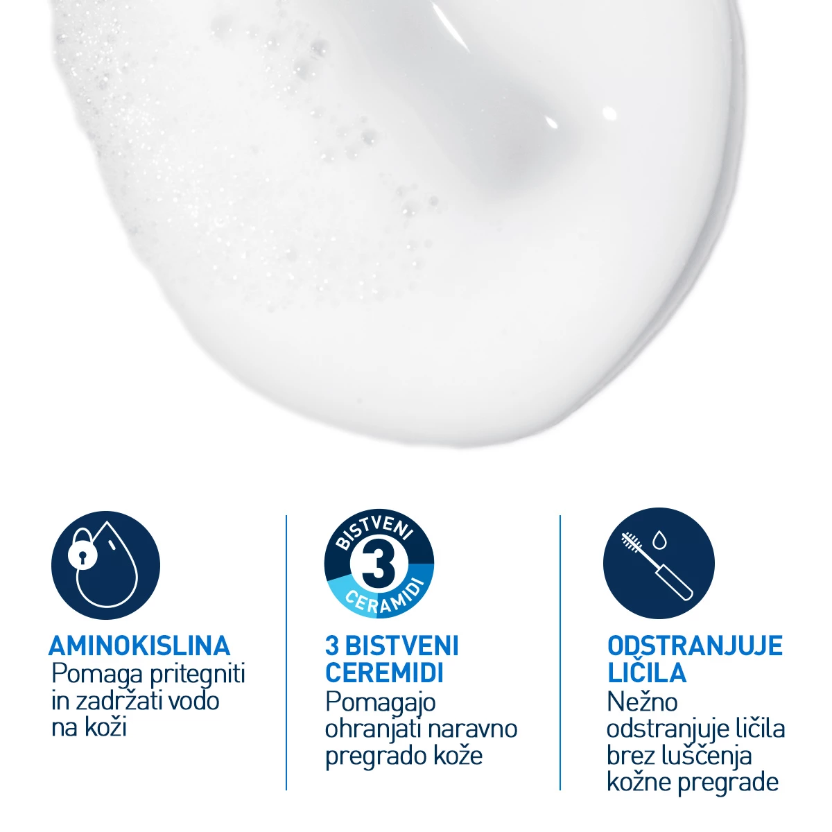 CeraVe vlažilna kremno-penasta čistilna emulzija nežno odstranjuje umazanijo, sebum, ostanke onesnaženja, kreme za zaščito pred soncem in ličila, ne da bi pri tem poškodovala naravno zaščitno pregrado kože. Formulacija, razvita v sodelovanju z dermatologi, združuje prednosti čistilne kreme in pene – na koži se najprej obnaša kot krema, nato pa se z vodo spremeni v mehko peno, ki kožo temeljito očisti, a jo hkrati ohranja navlaženo in brez občutka zategovanja.