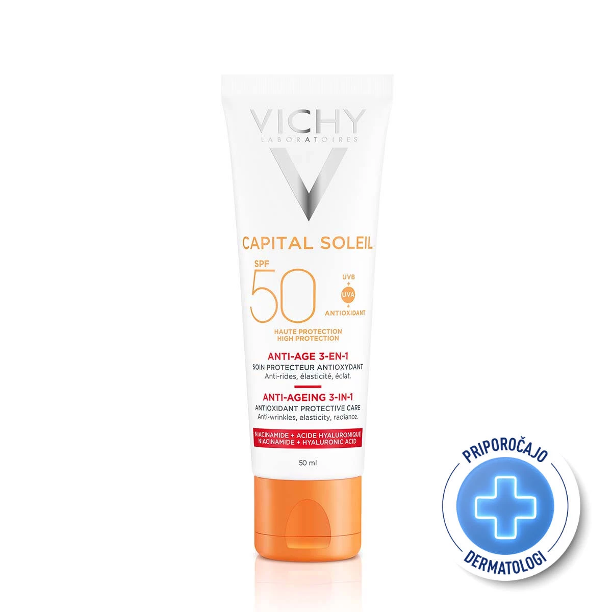 Vichy Capital Soleil krema za zaščito pred soncem z anti-age učinkom ZF 50 nudi visoko raven UV zaščite ter hkrati deluje proti vidnim znakom staranja kože. Njena kremna tekstura se hitro vpije, je suha na otip in na koži ustvari naraven mat zaključek brez mastnega občutka.