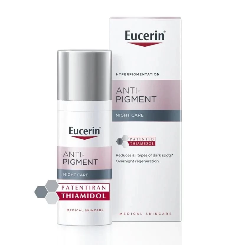 Eucerin Anti-Pigment nočna krema vsebuje Thiamidol, učinkovito in patentirano sestavino, ki deluje na sam vzrok hiperpigmentacije, tako da zmanjša tvorbo melanina. Klinično in dermatološko je potrjeno, da zmanjša temne madeže in preprečuje njihov ponovni nastanek. Prvi rezultati so vidni po dveh tednih in se z redno uporabo stalno izboljšujejo.