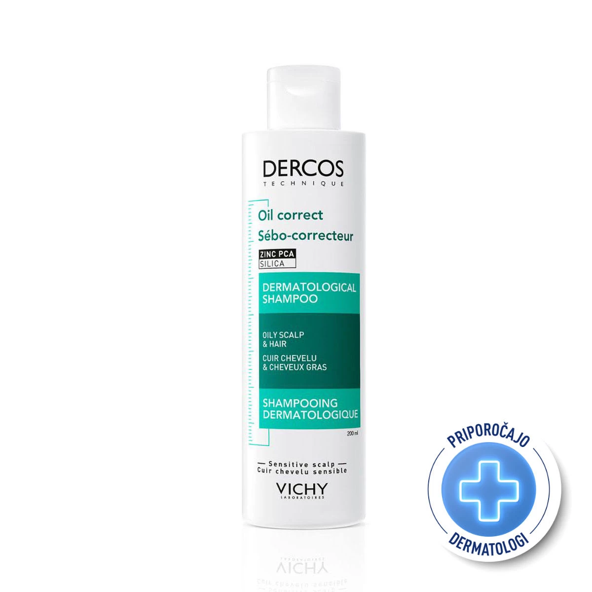 Vichy Dercos Šampon Oil Correct za urejanje mastnosti lasišča je dermokozmetični šampon, ki je klinično dokazano učinkovit pri mastnem lasišču in laseh ter pomaga uravnavati izločanje sebuma.