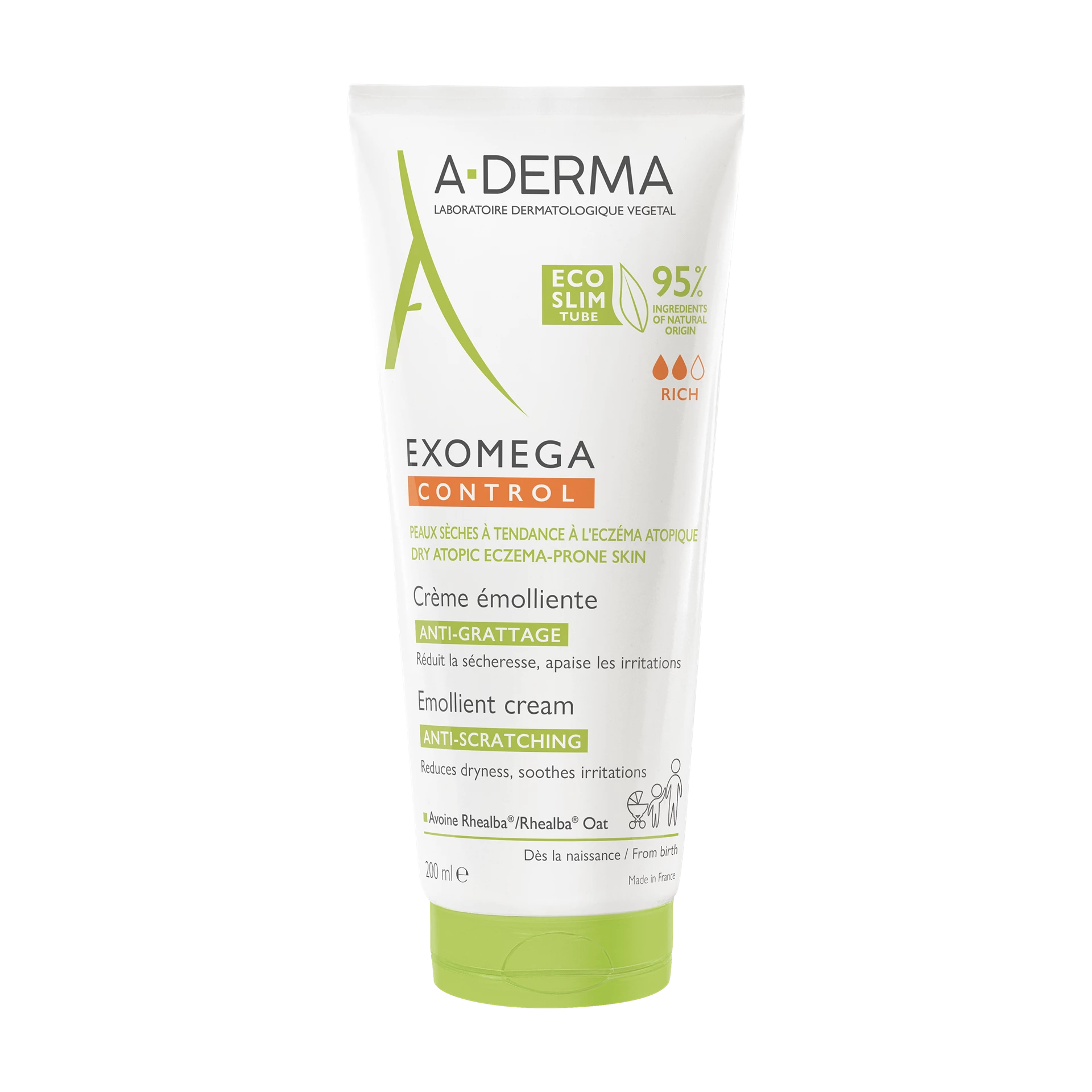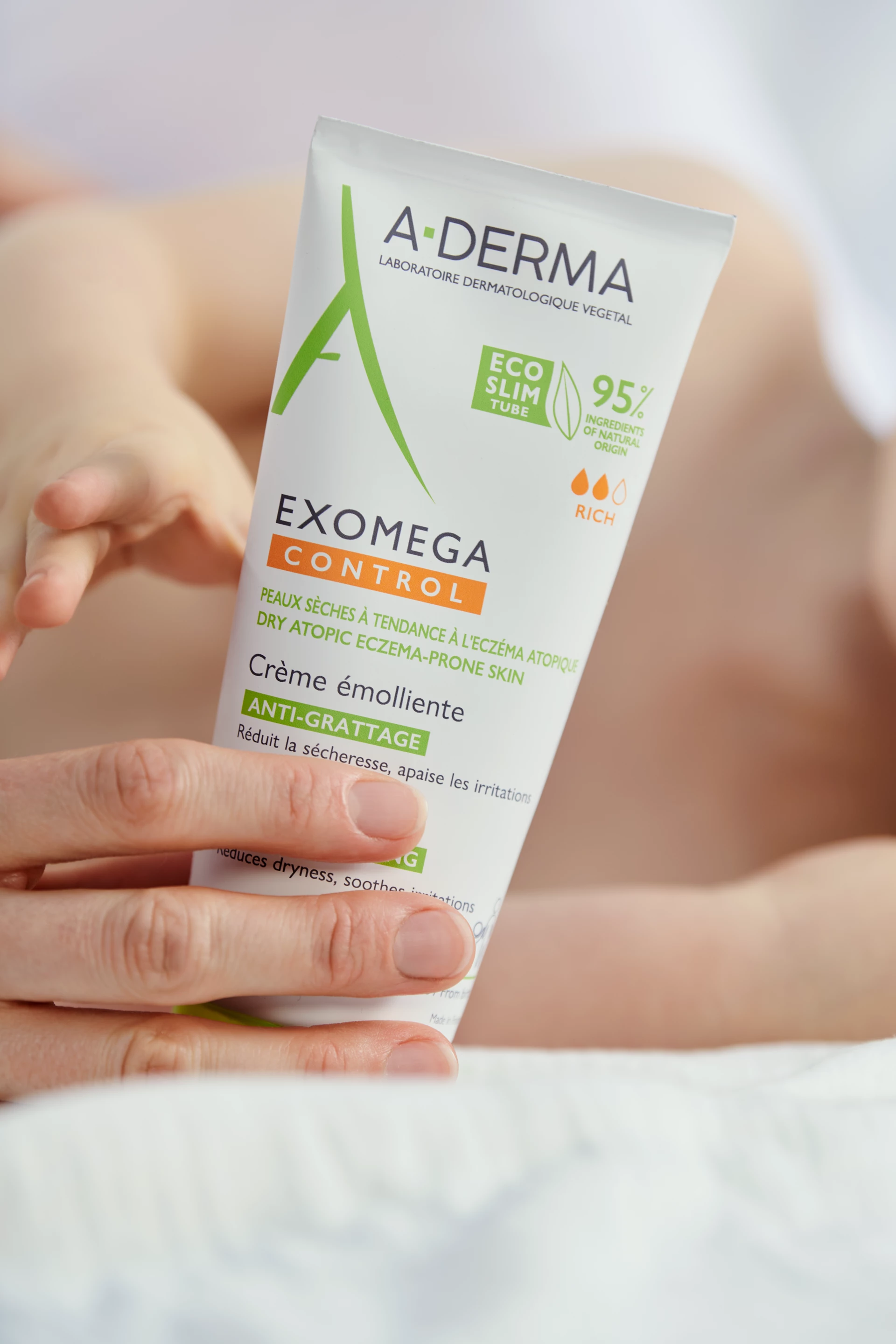A-DERMA EXOMEGA CONTROL emolientna krema preprečuje praskanje in uravnava občutek draženja. Za suho kožo nagnjeno k atopiji pri dojenčkih, otrocih in odraslih.