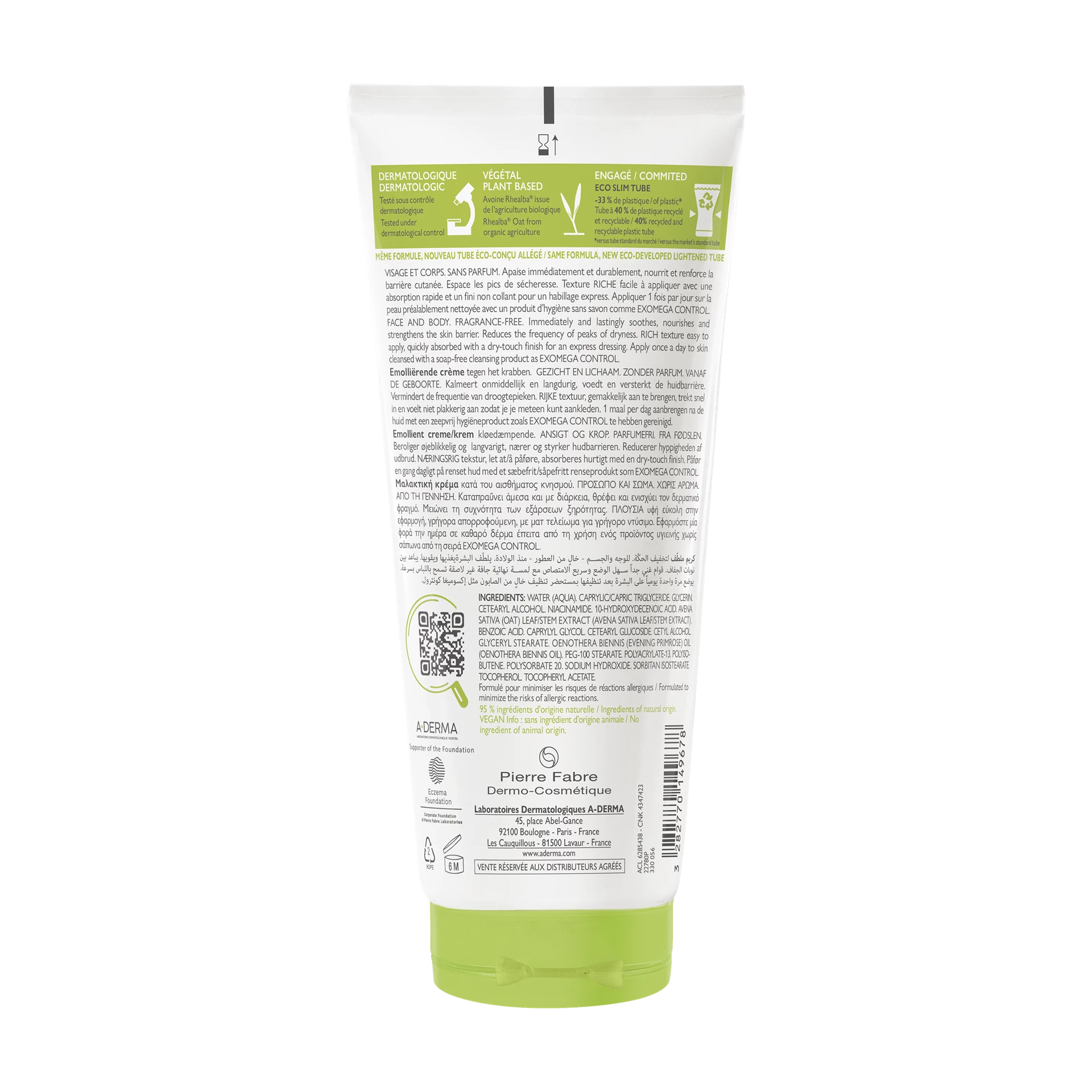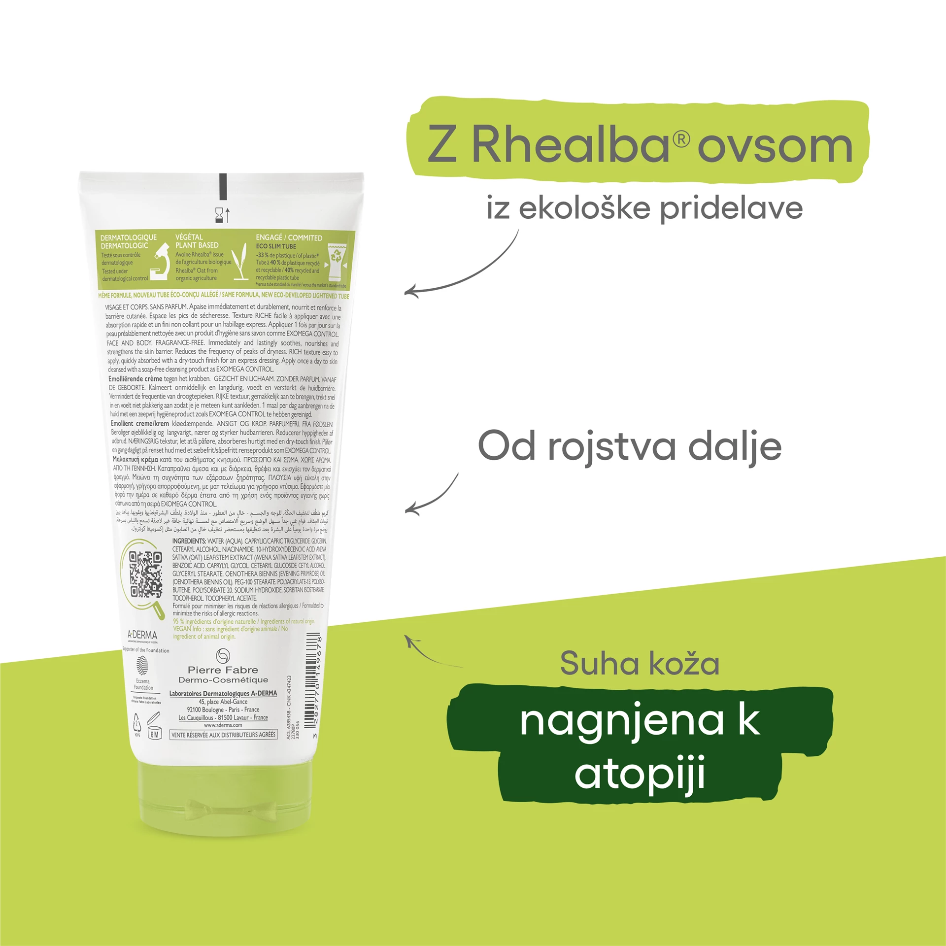 A-DERMA EXOMEGA CONTROL emolientna krema z ekstraktom iz poganjkov Rhealba® ovsa preprečuje praskanje in uravnava občutek draženja. Primerna je za suho kožo obraza in telesa nagnjeno k atopiji dojenčkov, otrok in odraslih. Uporaba kreme je dovoljena od rojstva naprej. Izdelek nemudoma pomiri kožo in uravnava občutek razdraženosti zaradi suhosti kože.