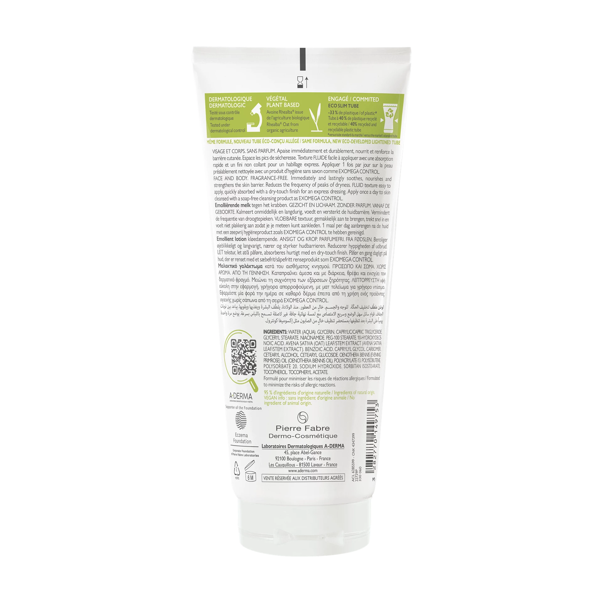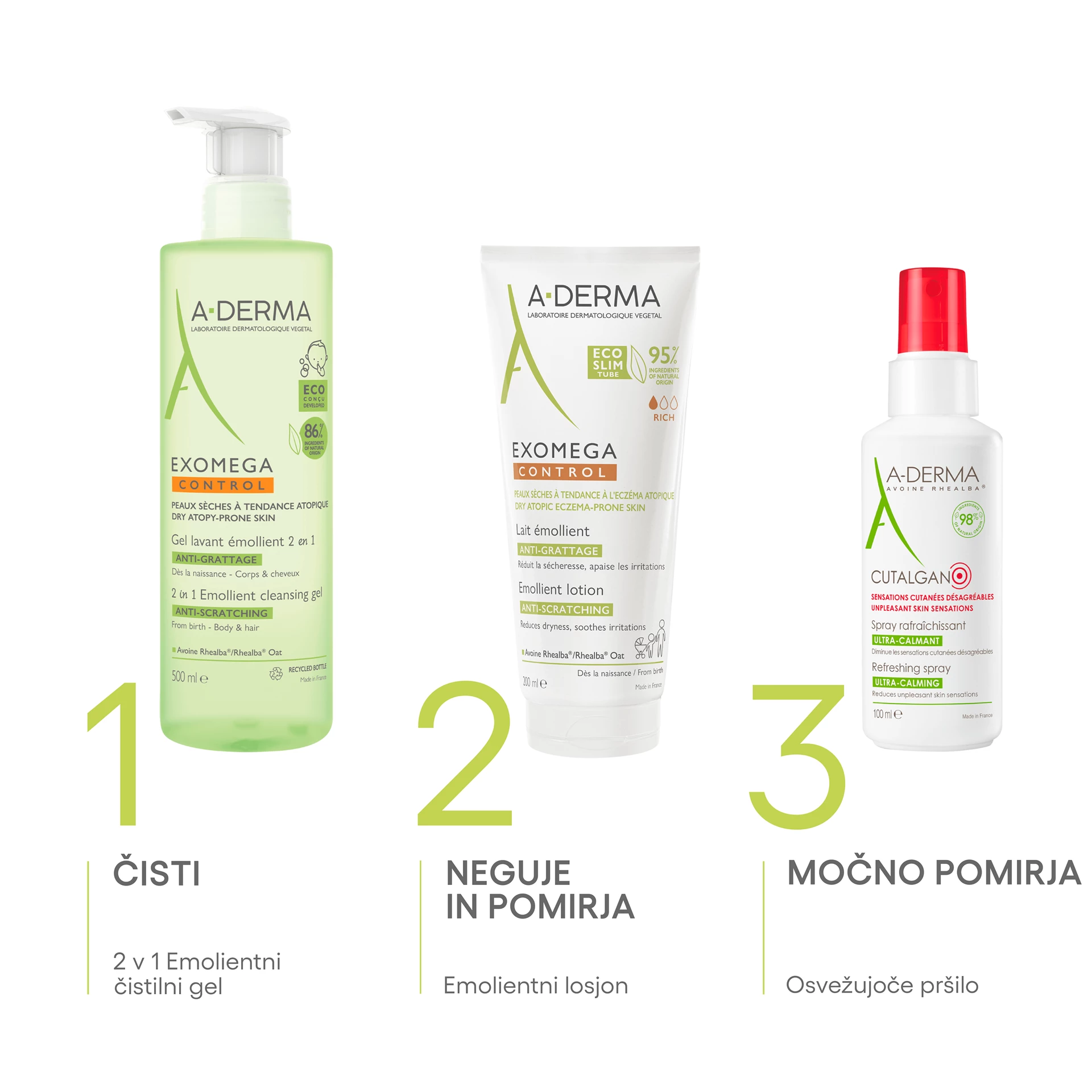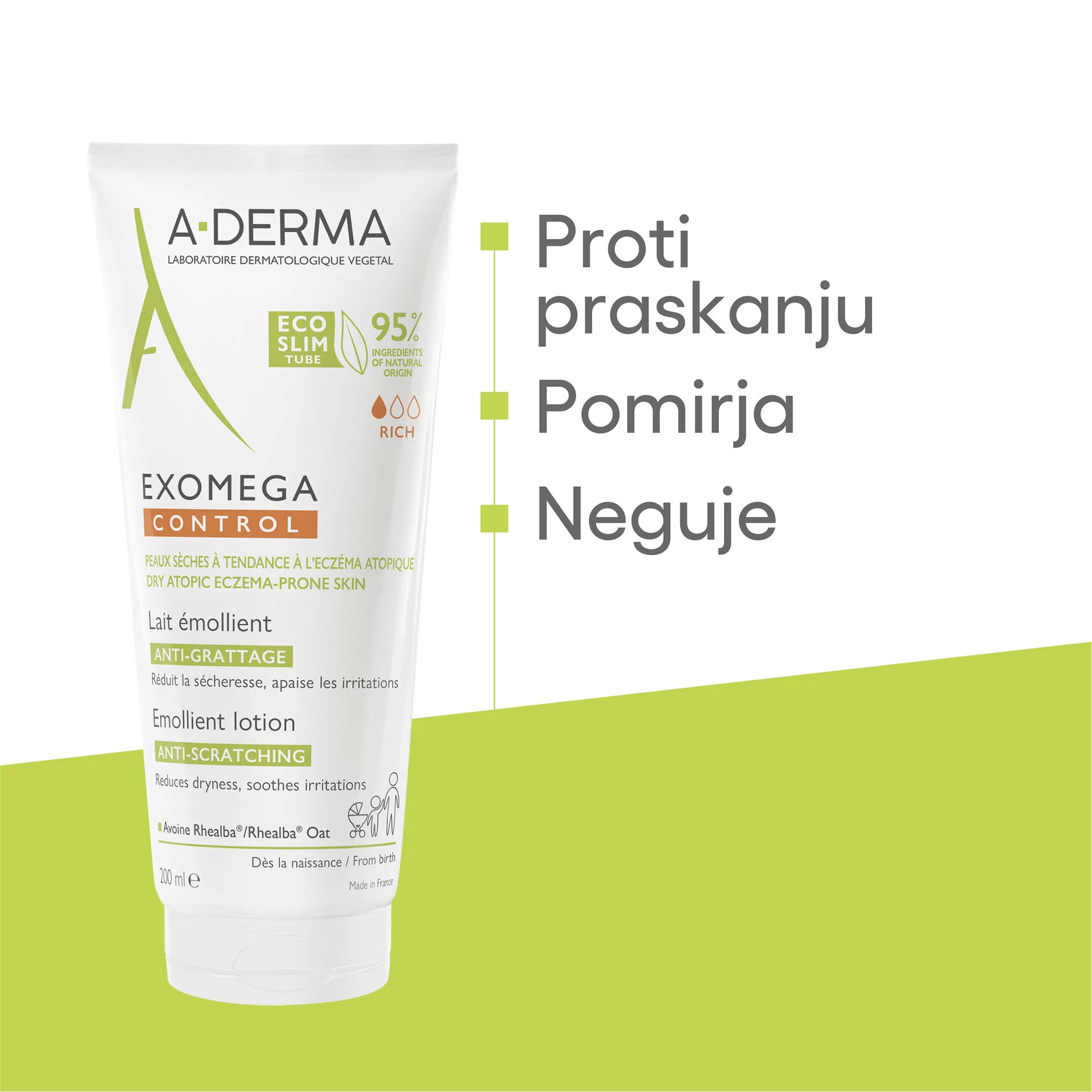 A-DERMA EXOMEGA CONTROL emolientni losjon z ekstraktom iz poganjkov Rhealba® ovsa preprečuje praskanje in uravnava občutek draženja. Primeren je za suho kožo nagnjeno k atopiji. Je neodišavljen in primeren za dojenčke, otroke, odrasle, za obraz in telo. Nemudoma pomiri kožo in uravnava občutek razdraženosti zaradi suhosti kože.