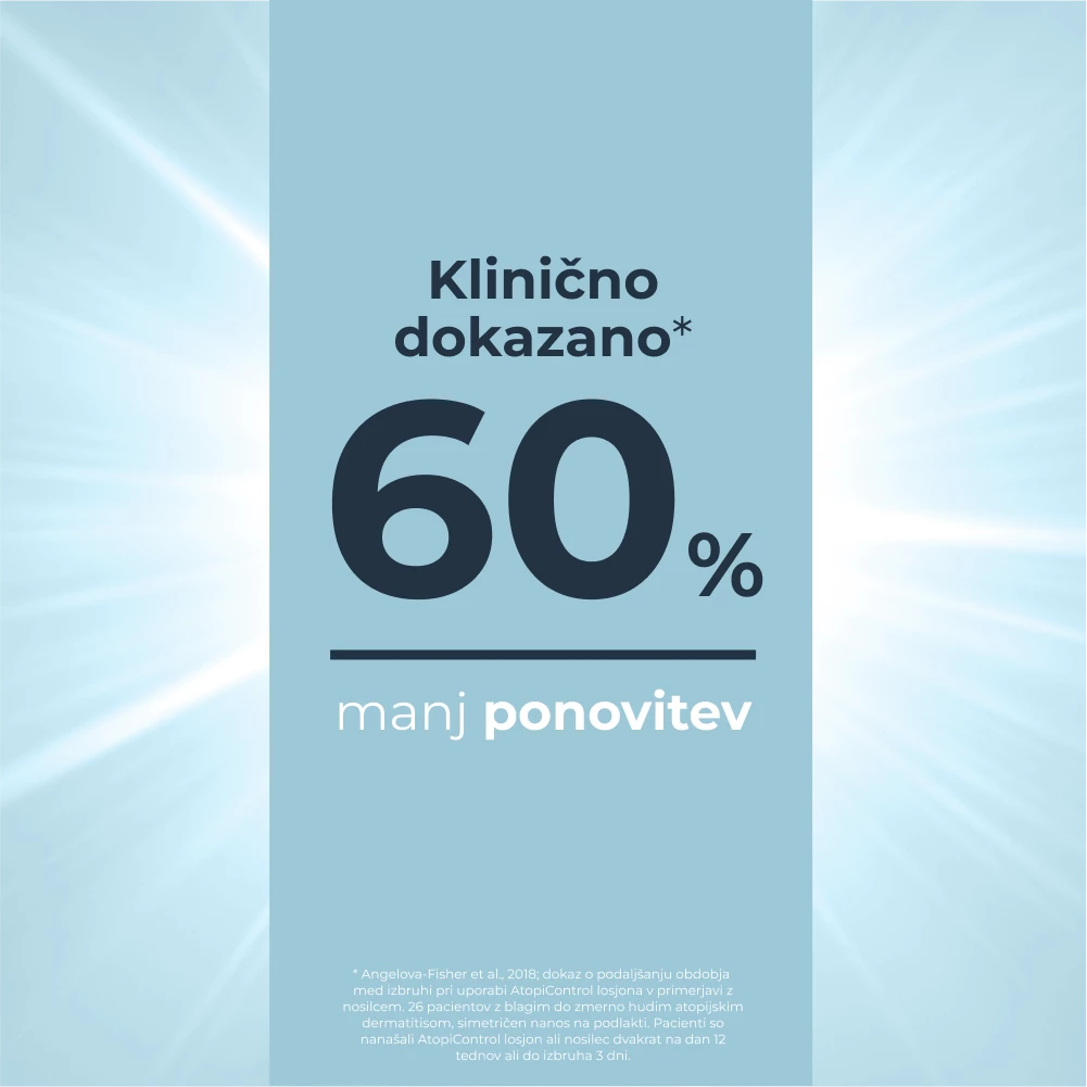 Eucerin AtopiControl losjon za nego telesa je brez dišav in se lahko med izbruhi uporablja tudi skupaj z Eucerin AtopiControl acute negovalno kremo. Pravilna nega kože izboljša kakovost življenja oseb z atopijskim dermatitisom.