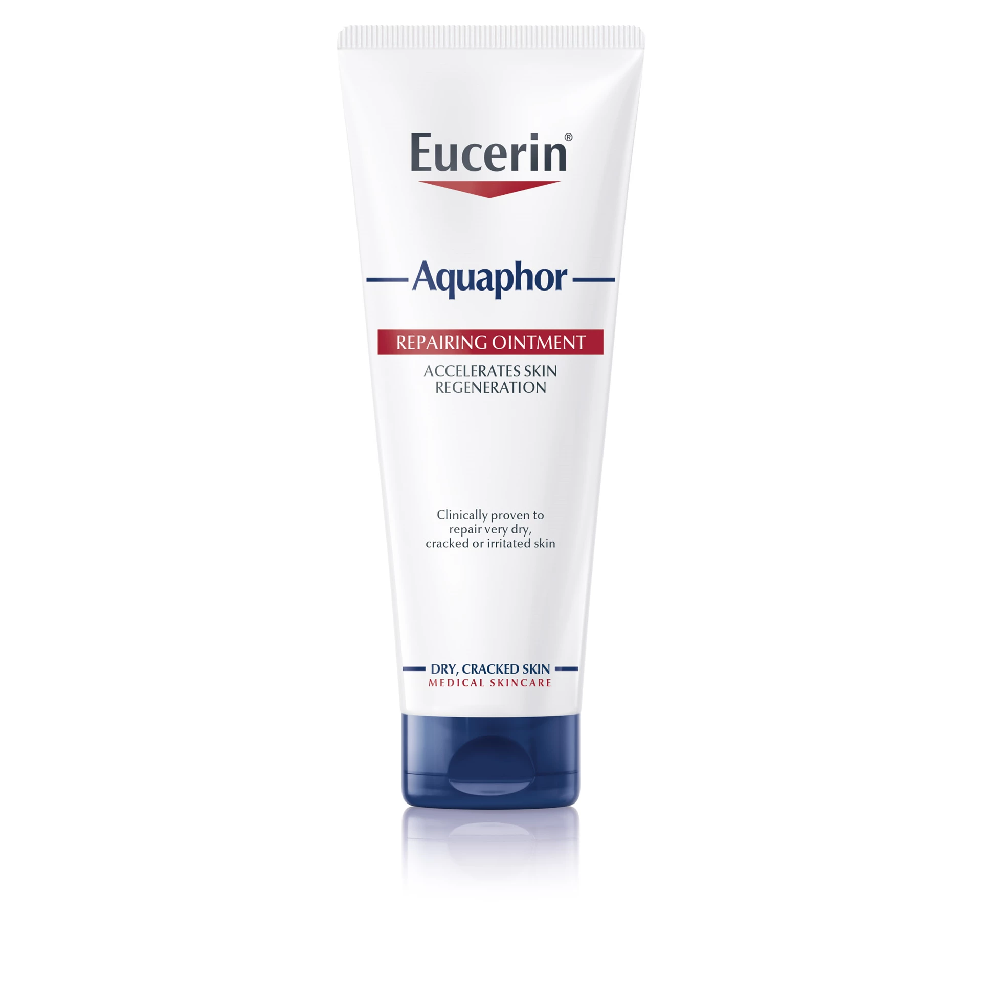 Eucerin Aquaphor obnovitveno mazilo oskrbi suho do zelo suho, razpokano in razdraženo kožo z nego za prvo pomoč, ki jo potrebuje. Mazilo brez vode na koži tvori nežno, delno okluzivno zaščitno bariero, ki spodbuja naravni prenos vodne pare in kisika v kožo in iz nje, kar koži omogoča, da »diha«, in okrepi njeno naravno zaščitno bariero. Mazilo je obogateno z glicerinom in pantenolom.