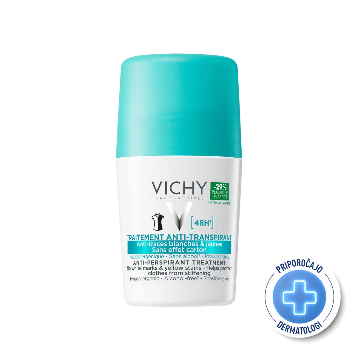 Vichy Deo Anti-Trace, deodorant proti belim sledem in rumenim madežem zagotavlja 48-urno učinkovito zaščito pred prekomernim potenjem, vidno zmanjšanje porumenelosti tekstila in kopičenja ostankov na tekstilu. Brez belih lis na temnih oblačilih.