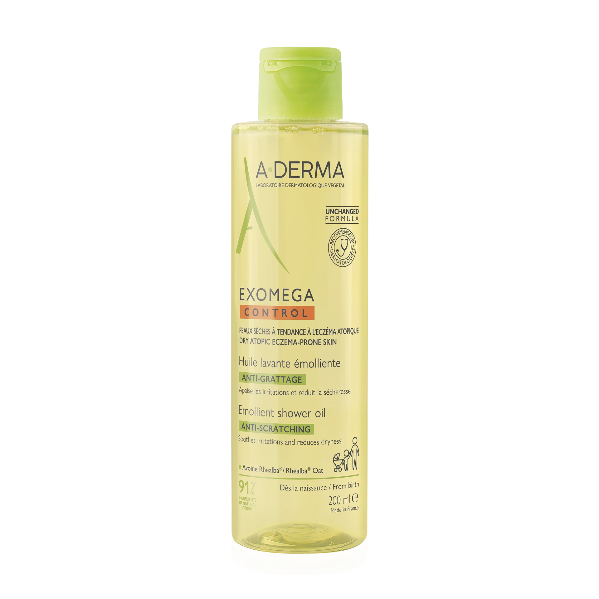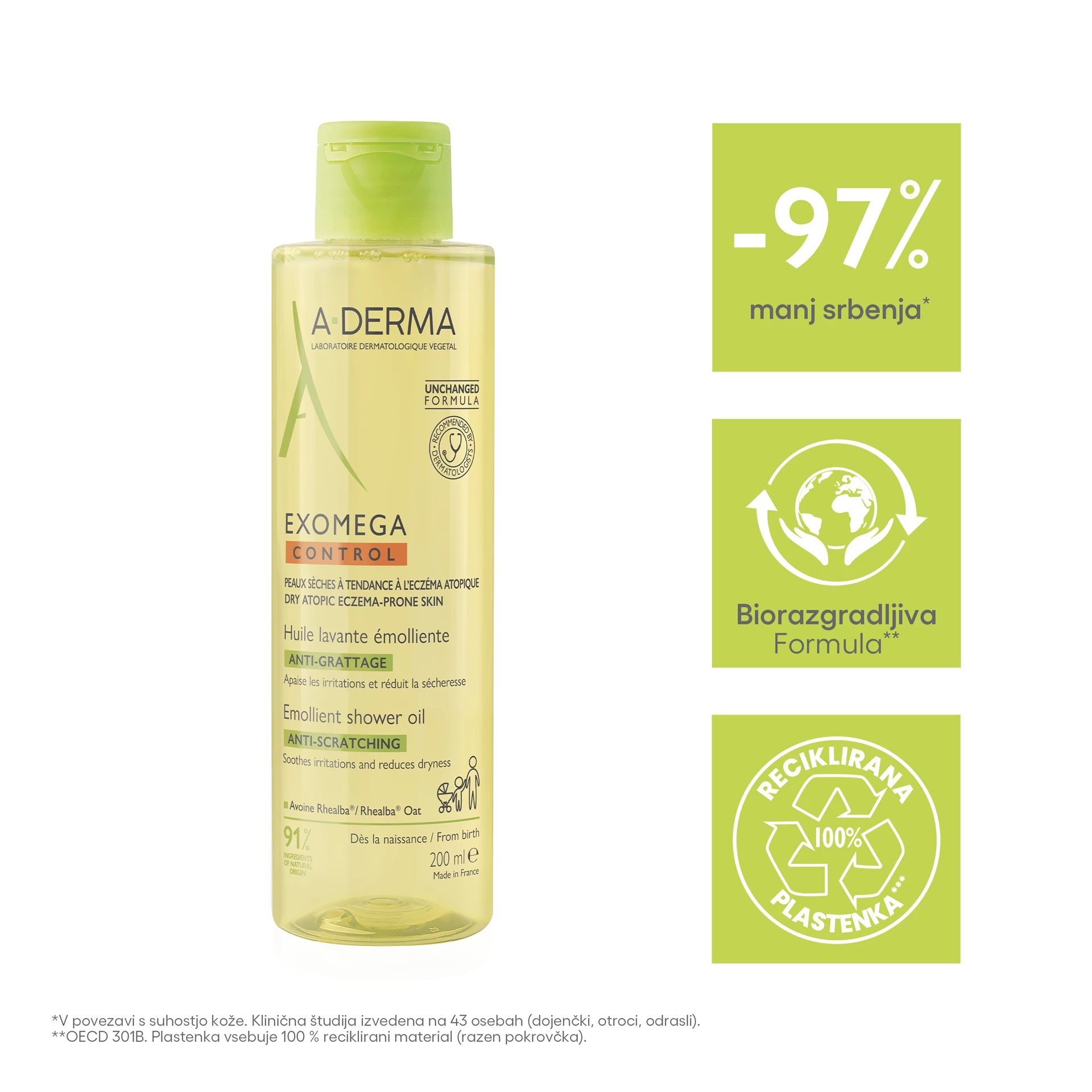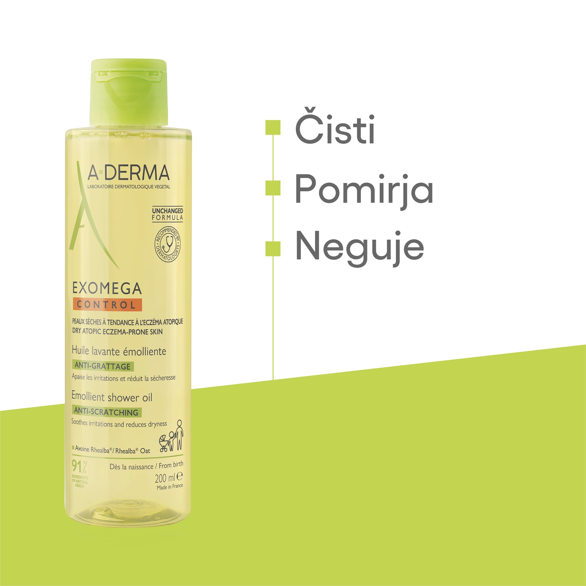 A-DERMA EXOMEGA CONTROL emolientno čistilno olje za tuširanje in kopanje nežno čisti in pomirja kožo. Primerno je za zelo suho in k atopijskemu dermatitisu nagnjeno kožo. Lahko se uporablja za umivanje kože obraza in telesa ter za kopanje, za vso družino od rojstva dalje, primerno je tudi za umivanje zunanjih intimnih predelov.