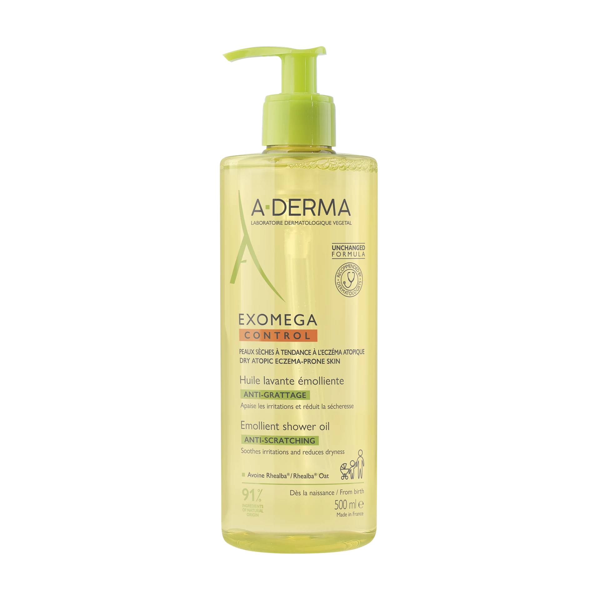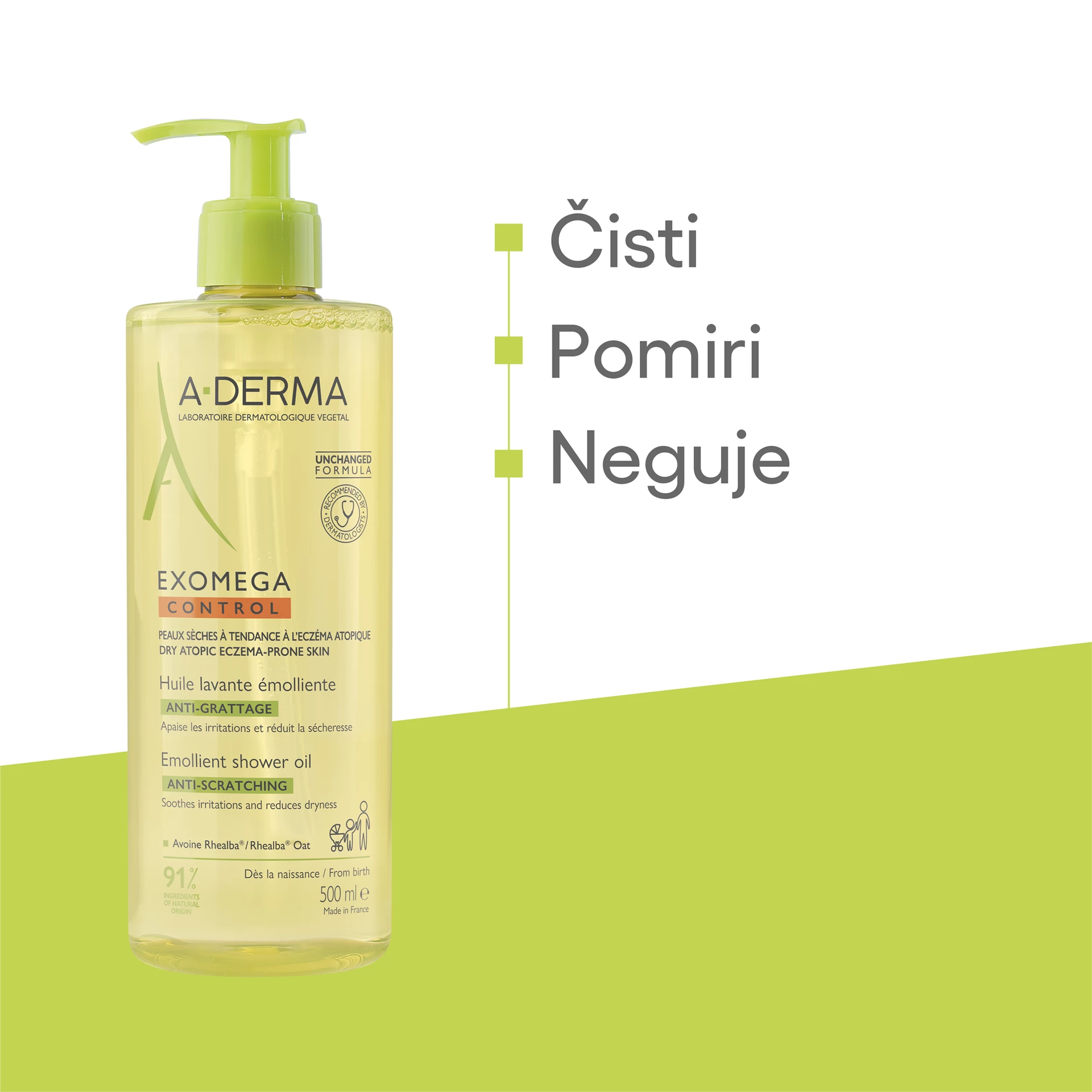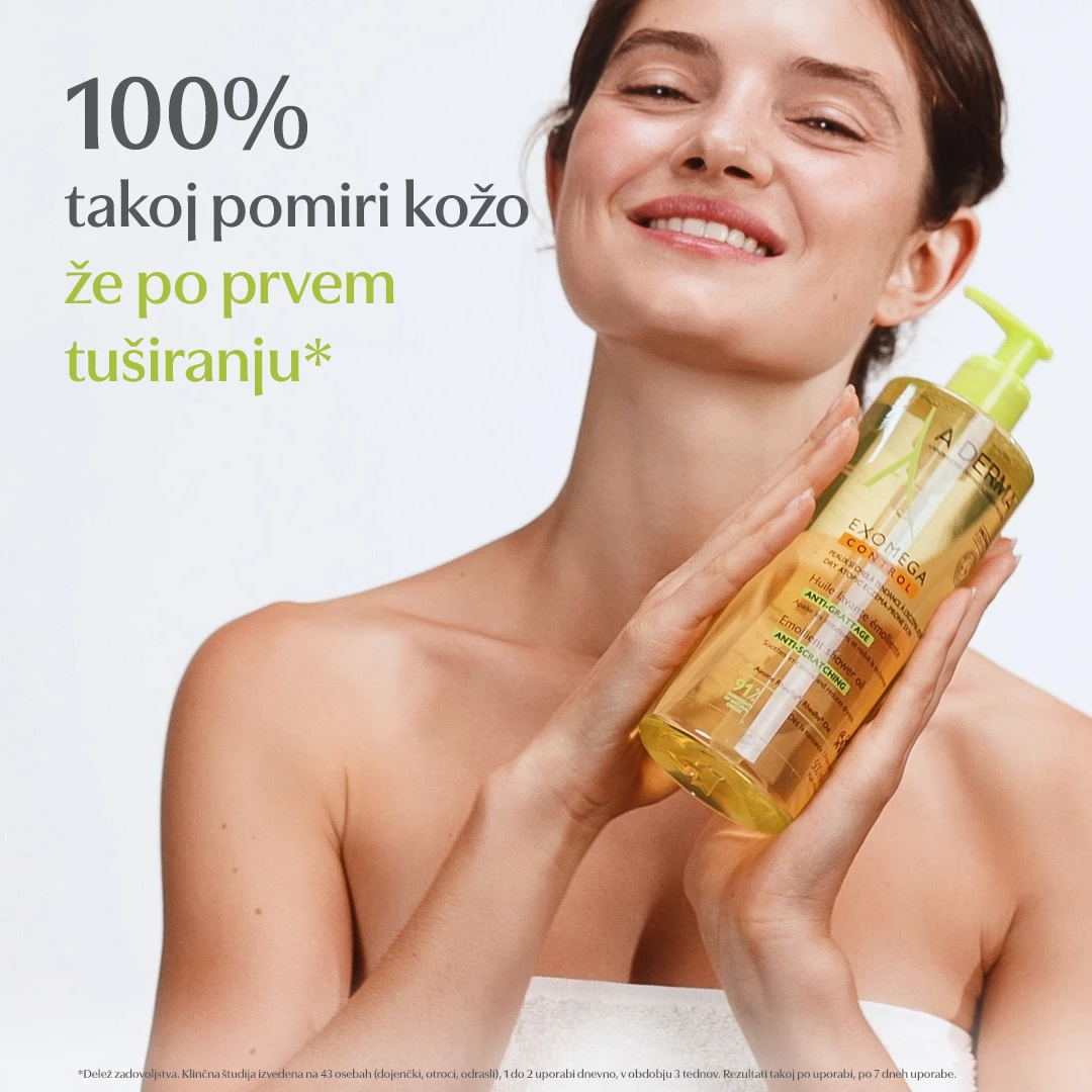 A-DERMA EXOMEGA CONTROL emolientno čistilno olje za tuširanje in kopanje nežno čisti in pomirja kožo. Primerno je za zelo suho in k atopijskemu dermatitisu nagnjeno kožo. Lahko se uporablja za umivanje kože obraza in telesa ter za kopanje, za vso družino od rojstva dalje, primerno je tudi za umivanje zunanjih intimnih predelov.