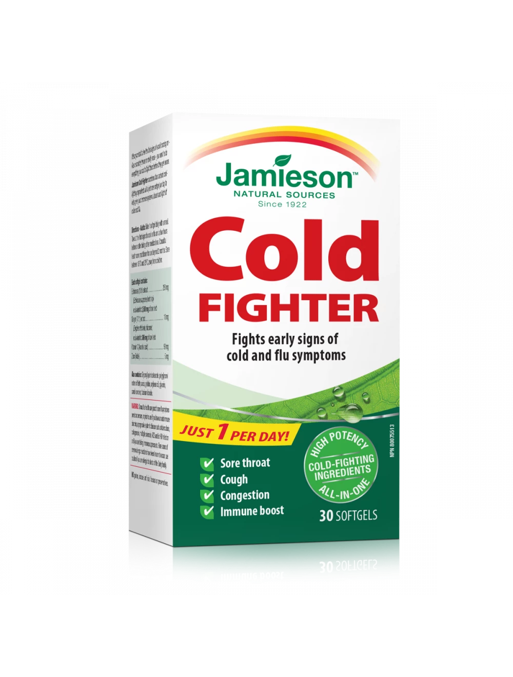 Jamieson Cold Fighter sedaj združuje štiri popolnoma naravne sestavine za boj proti prvim znakom prehlada in vam tako pomaga utrditi imunski sistem.* Zaradi nove mešanice sestavin je sedaj potrebna samo ena kapsula na dan!