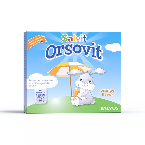 Prehransko dopolnilo Salvit Orsovit z minerali, sladkorjem in sladilom, z okusom pomaranče. Prašek za pripravo peroralne rehidracijske raztopine.