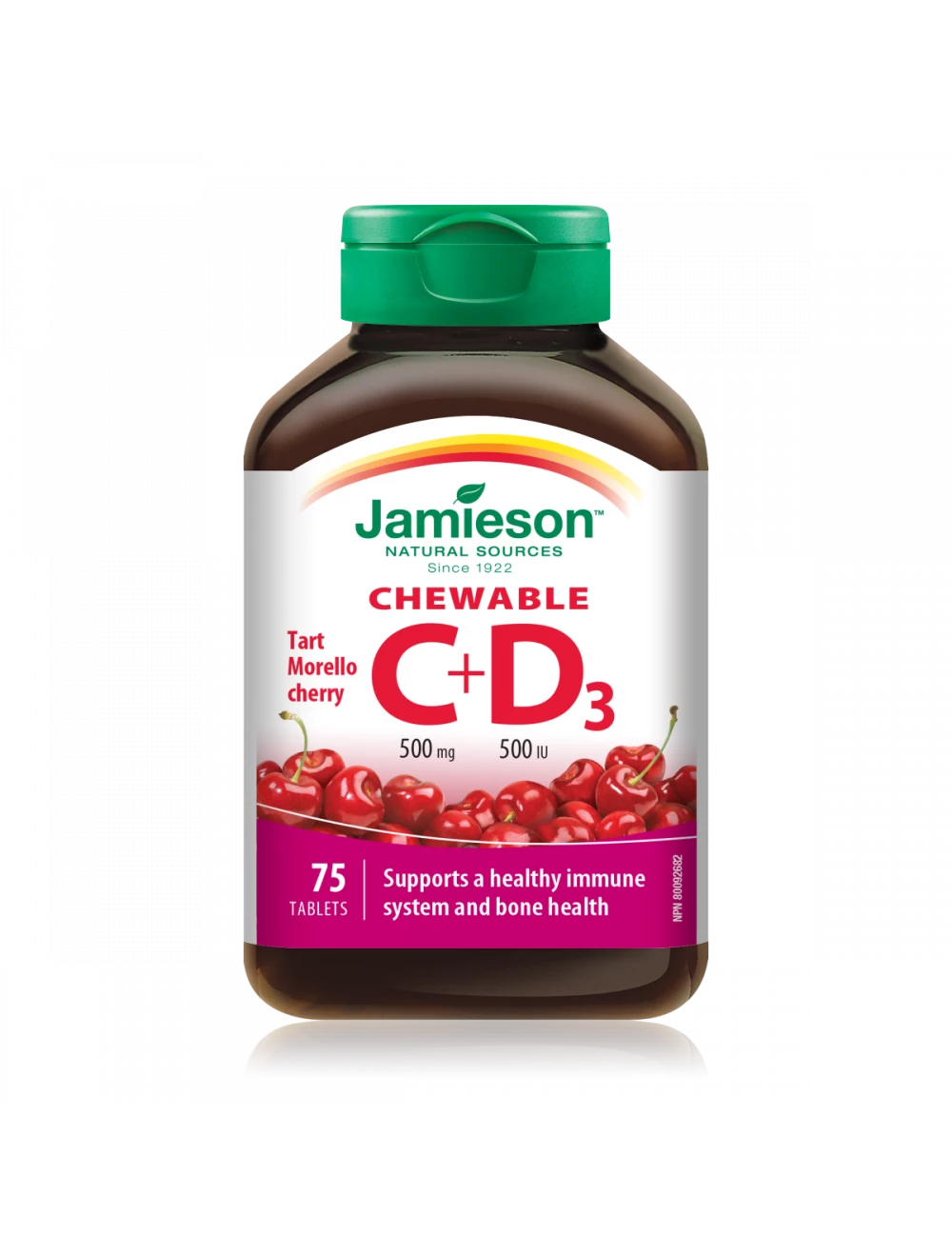 Prevleka tablete (vodotopna celuloza), askorbinska kislina, stabilizator (rastlinska stearinska kislina), sredstvo proti sprijemanju (silicijev dioksid, magnezijeve soli maščobnih kislin), naravni okus češnje, naravna barva češnje, morello češnjev sok, sladili (dekstroza, sukraloza), holekalciferol.
