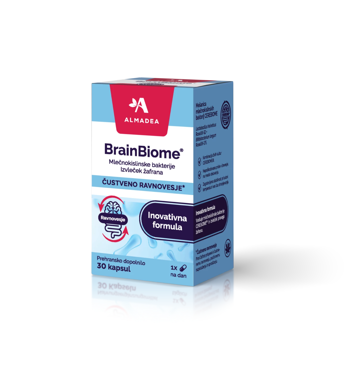 BrainBiome je prehranski dodatek, ki vsebuje mešanico mlečnokislinskih bakterij Lactobacillus helveticus Rosell-52 in Bifidobacterium longum Rosell-175 (CEREBIOME) ter izvleček žafrana, ki prispeva k čustvenemu ravnovesju, pozitivnemu razpoloženju in sproščenosti. Vsaka kapsula vsebuje vsaj 3 x 10^9 bakterij in je stabilna pri sobni temperaturi.