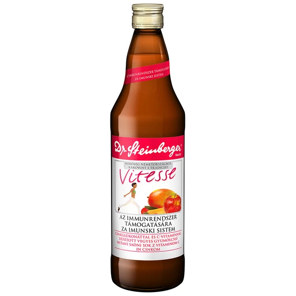 Dr. Steinberger Vitesse je naravni sok, posebej zasnovan za podporo vašemu imunskemu sistemu. Bogat je z vitamini, minerali in antioksidanti, ki pomagajo krepiti naravno obrambo telesa ter povečujejo energijo in vitalnost. Sok vsebuje skrbno izbrane sestavine, ki spodbujajo zdravje in dobro počutje vsak dan.