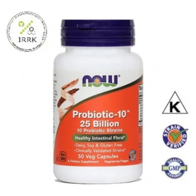 NOW Probiotic-10 zagotavlja v 1 kapsuli 10 različnih sevov kultur mikrooorganizmov v izredno velikem številu – 25 milijard mikrooorganizmov, ki tvorijo kolonijo in so odporne na želodčno kislino. Z dodanim prebiotikom FOS (fruktooligosaharidi).