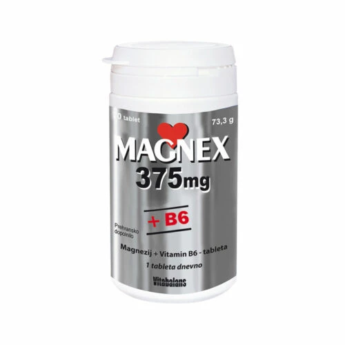 Vitabalans Magnex 375 mg + vitamin B6 vsebuje magnezij v obliki oksida in vitamin B6, ki skupaj prispevata k številnim pomembnim telesnim funkcijam.