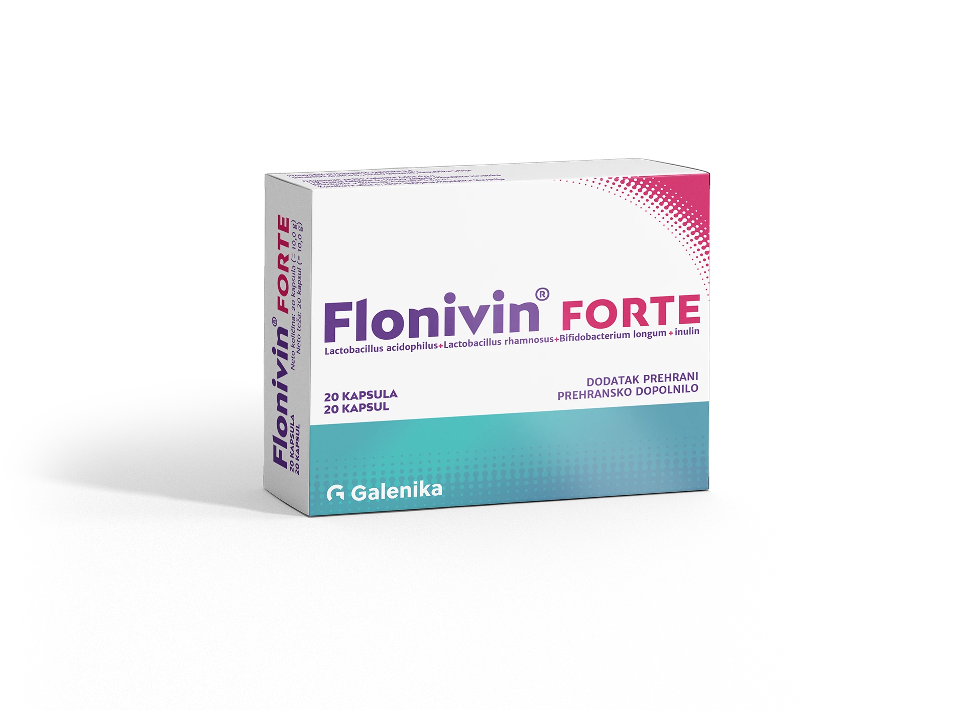 Flonivin Forte kapsule vsebujejo skupno 10 milijard bakterij (Lactobacillus acidophilus, Lactobacillus rhamnosus, Bifidobacterium longum) in inulin.