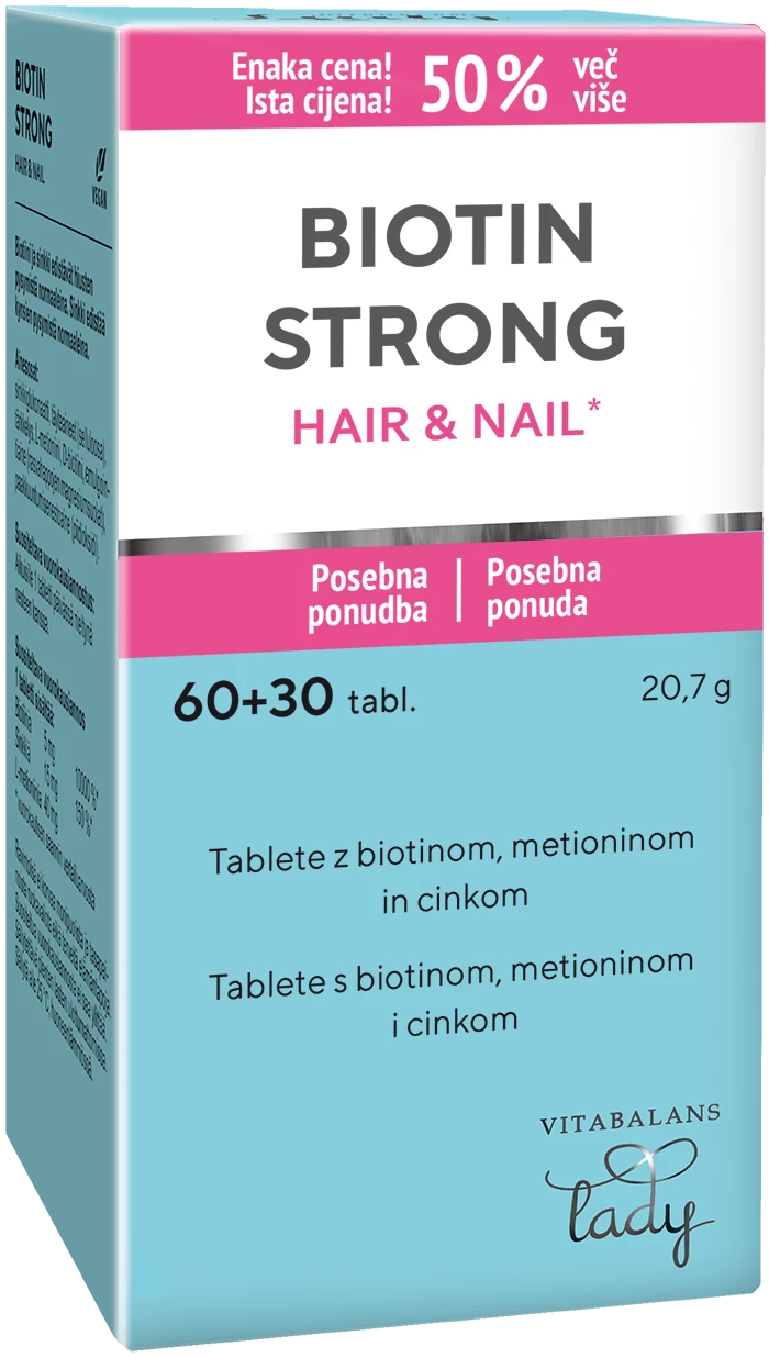 Vitabalans Biotin Strong vsebuje biotin, cink in metionin, ključno kombinacijo za ohranjanje zdravih las, kože in nohtov. Biotin (vitamin B7) prispeva k ohranjanju zdravih las, cink pa podpira številne telesne procese, povezane z zdravjem nohtov, lasišča in kože.