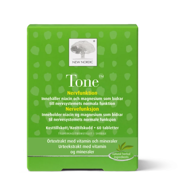 Tone New Nordic tablete na osnovi rastlinskih izvlečkov ajde, galganta, borovnic in hmelja ter z niacinom in magnezijem.