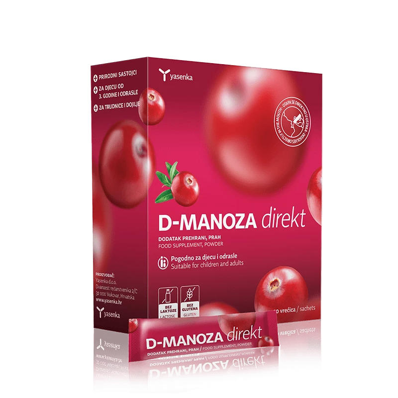 Yasenka D-manoza Direkt je prehransko dopolnilo v praktičnih vrečicah za direktno raztapljanje v ustih, ki vsebuje 2g D-manoze in 100 mg izvlečka plodu ameriške brusnice. Vsebuje visok odmerek D-manoze, ki veže bakterije, ki se razmnožujejo v mehurju. Vezavna afiniteta E.coli na molekule D-manoze je večja od vezavne afinitete na uroepitelij. Večje število molekul D manoze zagotavlja bolj aktivno površino, ki lahko veže bakterije E.coli. Bakterija, vezana na D-manozo, se iz telesa izloči z uriniranjem. D-manoza je preprost sladkor, ki zmanjša občutek nelagodja in pospeši okrevanje.