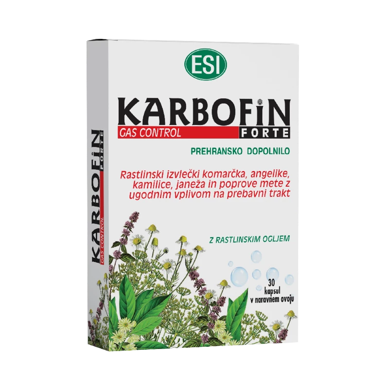 Karbofin Forte je prehransko dopolnilo, ki ugodno vpliva na prebavni trakt pri blažjih prebavnih težavah, z 100% naravnimi sestavinami. Vsebuje skrbno izbrane rastlinske izvlečke, kot so komarček, angelika, kamilica, janež in poprova meta, ter rastlinsko oglje, ki skupaj podpirajo zdravje prebavnega sistema in pomagajo pri težavah, kot so napihnjenost, plini in prebavne motnje.