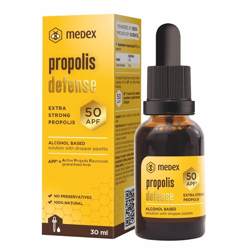 Medex Propolis Defense APF50 je alkoholna tinktura na osnovi standardiziranega propolisa. Jakost Medexovih izdelkov Propolis Defense je standardizirana z APF faktorjem (Active Propolis Flavonoids). APF 50 pomeni, da je koncentracija flavonoidov iz propolisa minimalno 50 mg/ml.