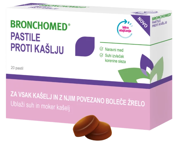 Pastile Bronchomed so naravni blažilni pripravek, zasnovan za lajšanje dražečih simptomov vnetja žrela in ustne votline. Vsebujejo dragoceni sestavini slez in med, ki delujeta kot balzam – pomirjata vneto sluznico in jo prekrijeta z zaščitno plastjo. Ta plast ščiti pred draženjem, omogoča sluznici, da si opomore, ter blaži suh in dražeč kašelj. Suh kašelj pomirjajo tako, da blažijo draženje receptorjev za kašelj in preprečujejo refleks kašlja, pri mokrem kašelju pa pomagajo odstraniti odvečno sluz in lajšajo izkašljevanje.