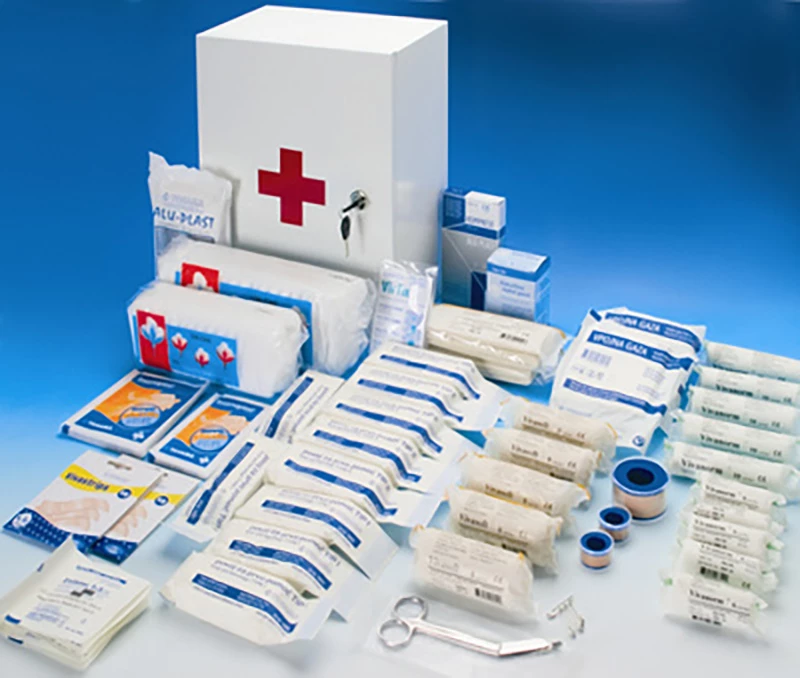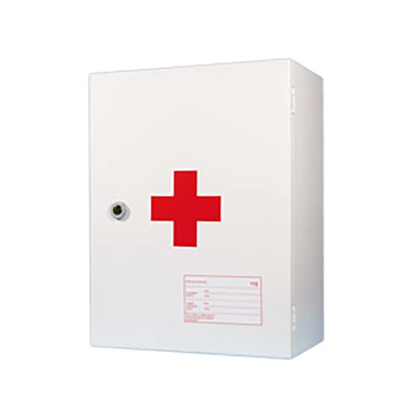 Omarica za prvo pomoč je izdelana iz kakovostne bele pločevine s ključavnico in stenskimi nosilci. Tako omarica kot rezervni komplet sta izdelana v skladu z novim Pravilnikom o organizaciji, materialu in opremi za prvo pomoč na delovnem mestu.