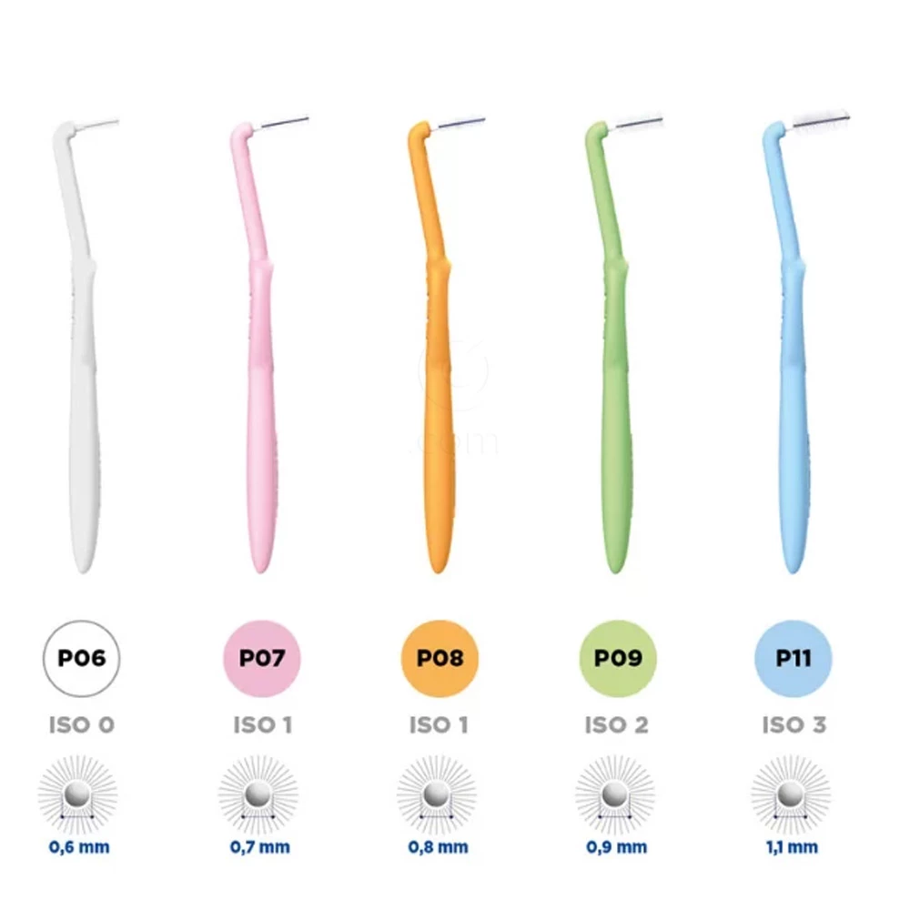 Medzobne ščetke CURASEPT PROXI PREVENTION ANGLE so na voljo v 5 različnih velikostih od ISO 0 do ISO 3, od Ø 0,6 mm do Ø 1,1 mm in so namenjene čiščenju medzobnih prostorov ob zdravi dlesni.