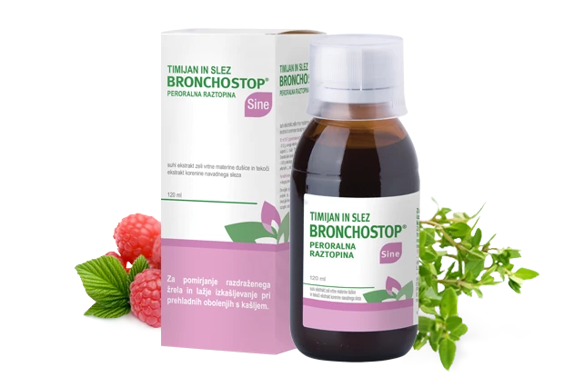 Zdravilo Timijan in slez Bronchostop Sine peroralna raztopina se uporablja za pomirjanje razdraženega žrela in lažje izkašljevanje pri prehladnih obolenjih s kašljem.